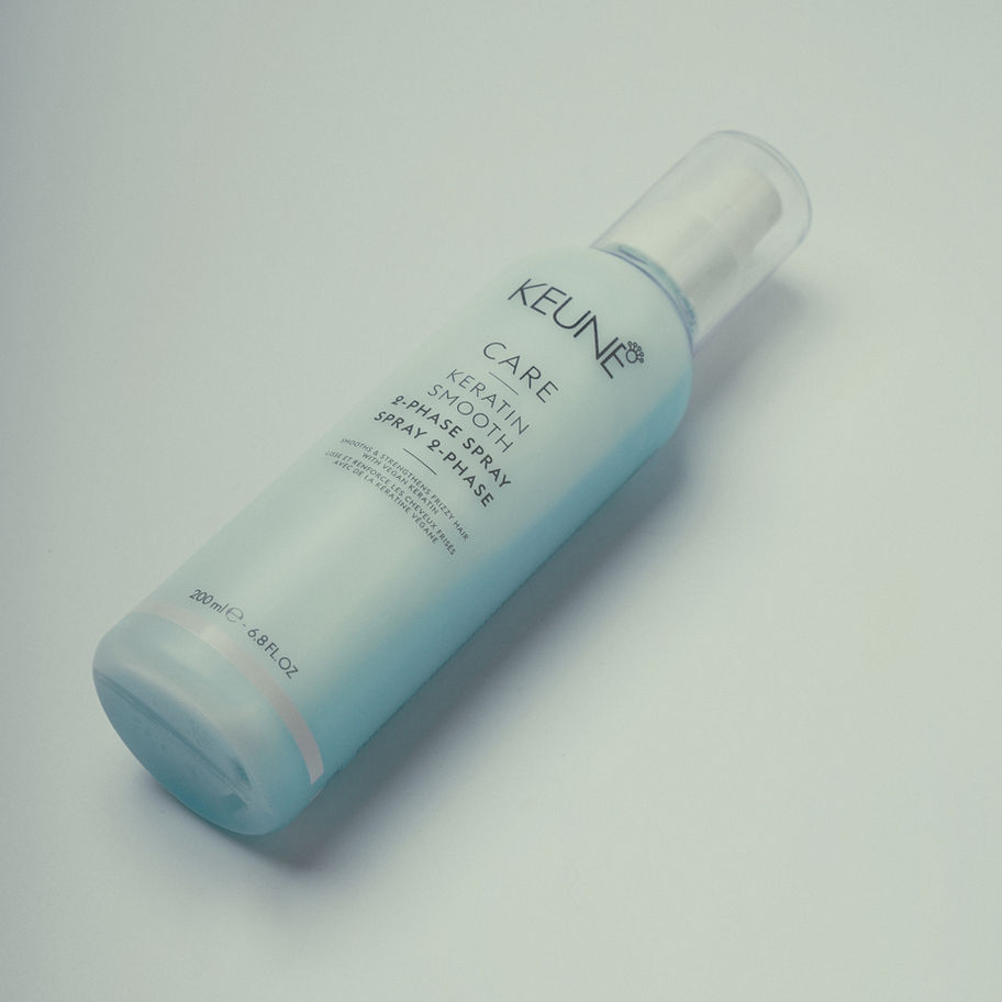 Двофазний спрей Care Keratin Smooth 2-Phase Spray від Keune розроблений на основі кератину та технології Silsoft, моментально розгладжує пасма, насичує вологою, збагачує структурними елементами та посилює природний блиск.